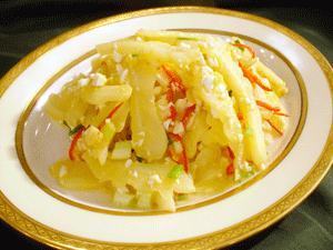 3.起一鍋爆香蒜末,鹹蛋黃、高湯後將蛋黃拌散開來再加入苦瓜片,炒9分熟後加入切丁的蛋白拌勻,起鍋前灑上蔥花。